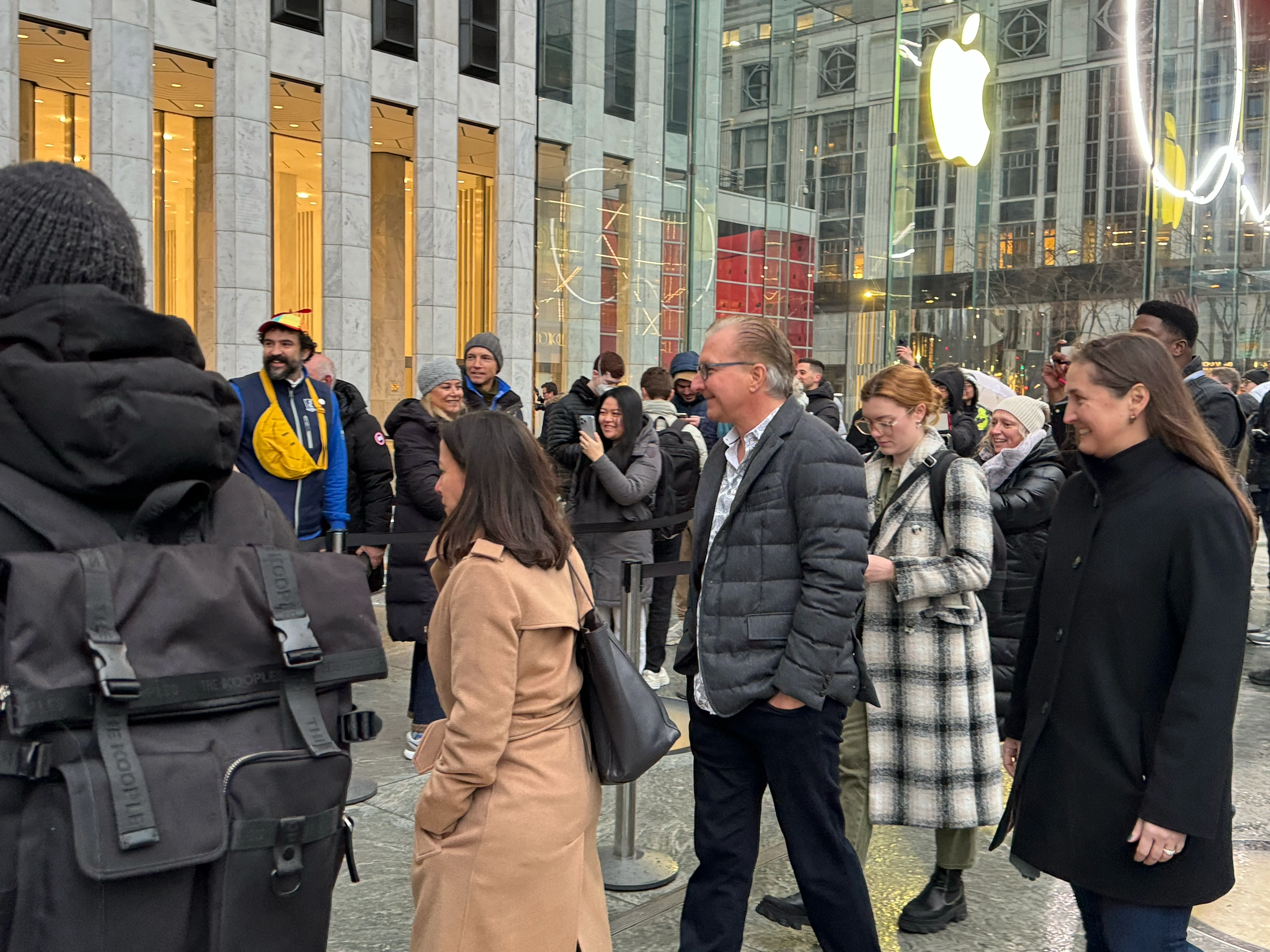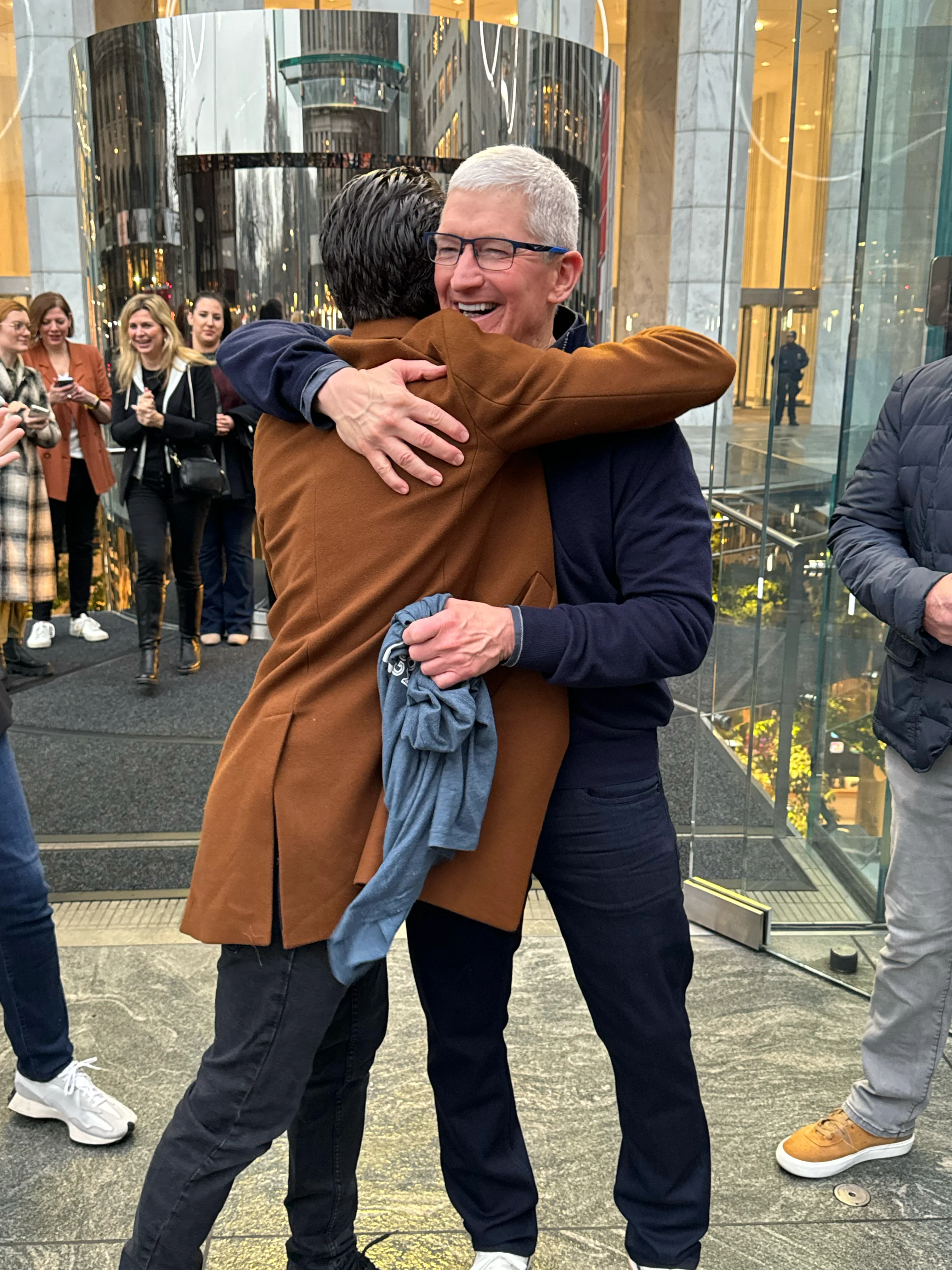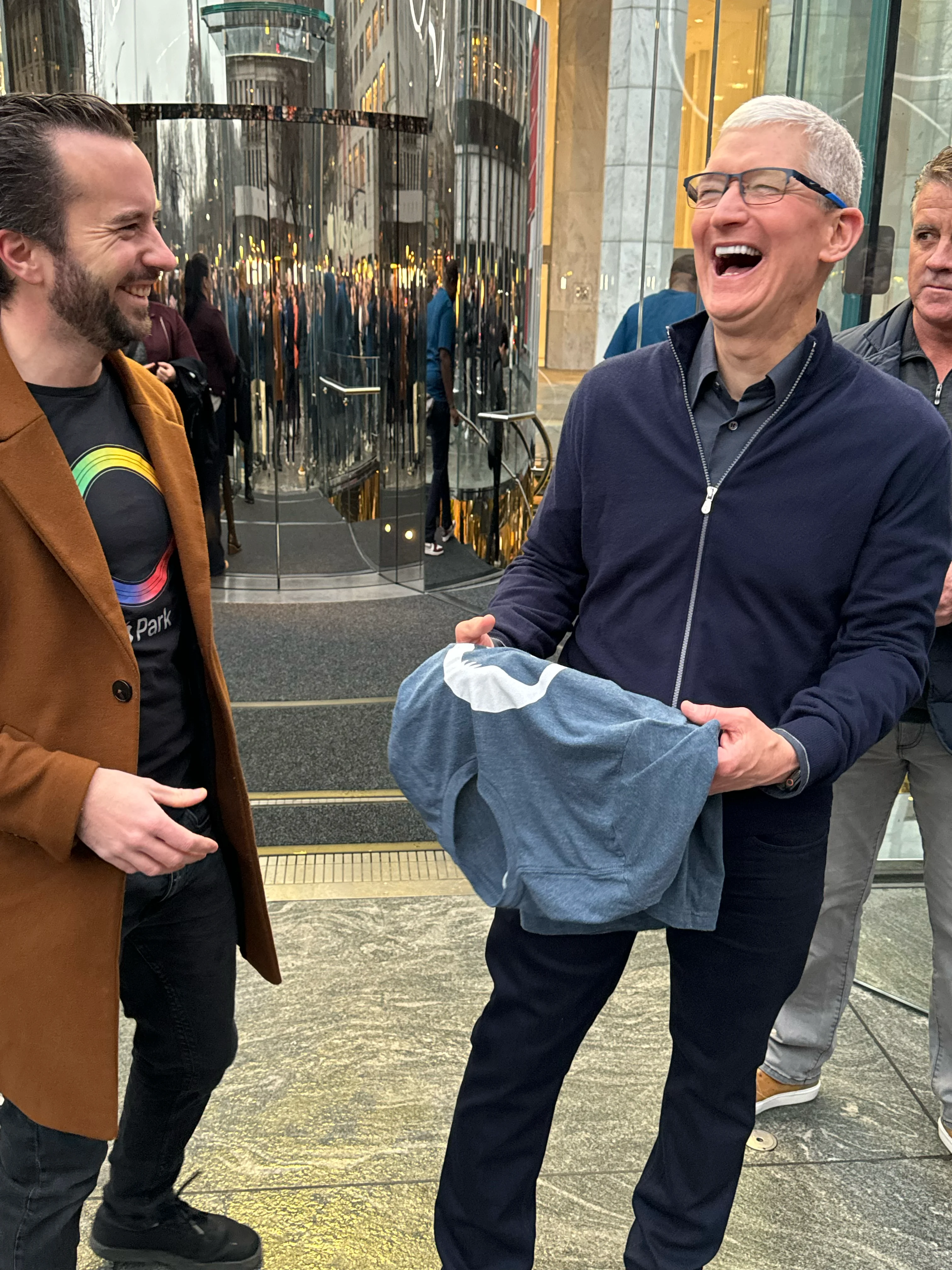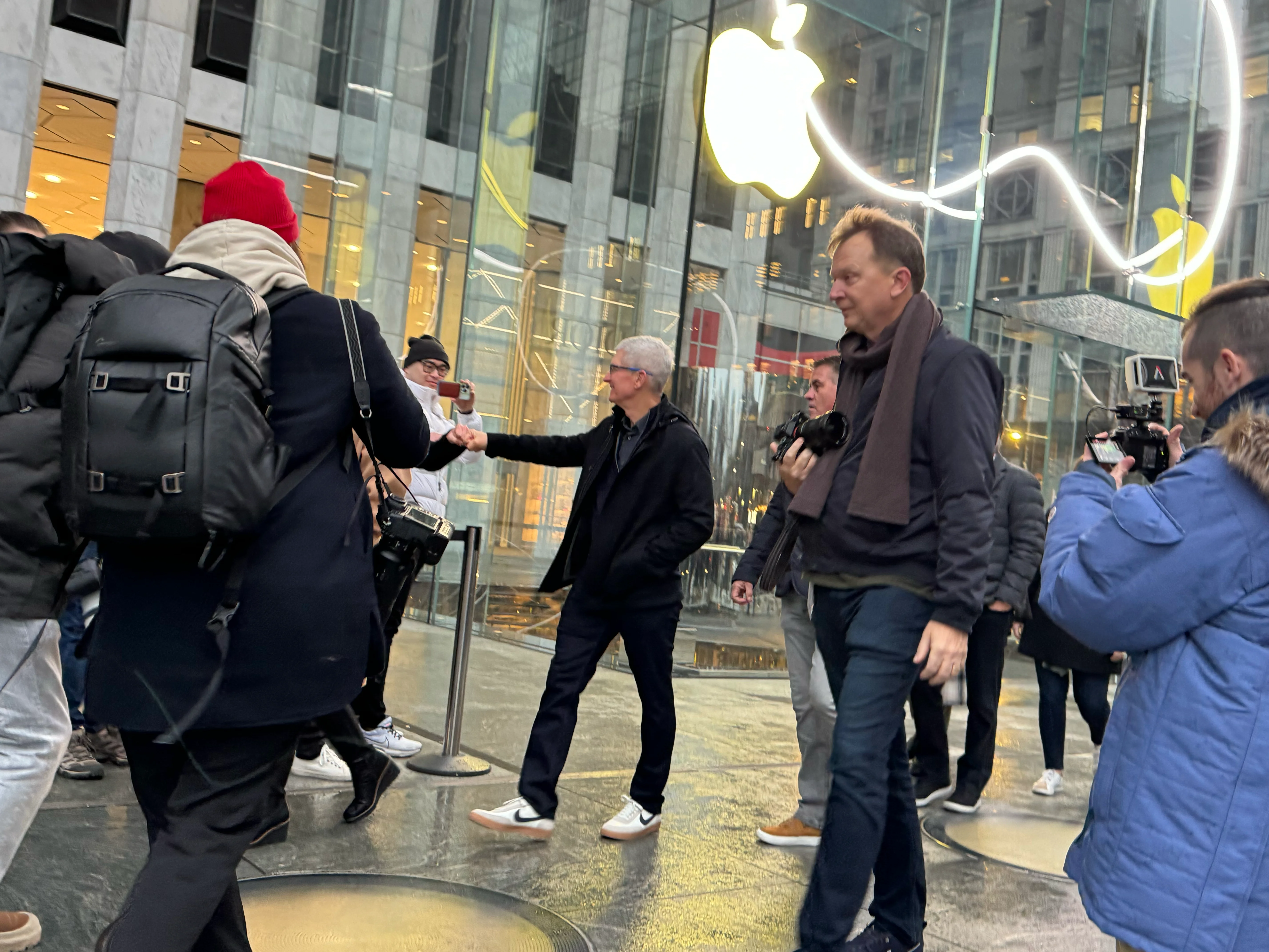 I had an 8:15am appointment at Apple Fifth Avenue to pick up my (cough, two, cough) Apple Vision Pro. I got there around 7:30 because I figured there’d be some amount of cool stuff/vibe happening. I only hoped Tim would be there, as he was for iPhone 15 launch, but I had no way of knowing for sure. Then at maybe 7:40 the crowd reacts and suddenly he’s walking past fist bumping those in queue, Joz closely behind him. I’m not even in queue yet, I was just walking around. I thought this would be it, cool to see him from a near distance. Grabbed a few shots.
