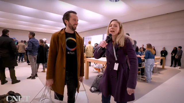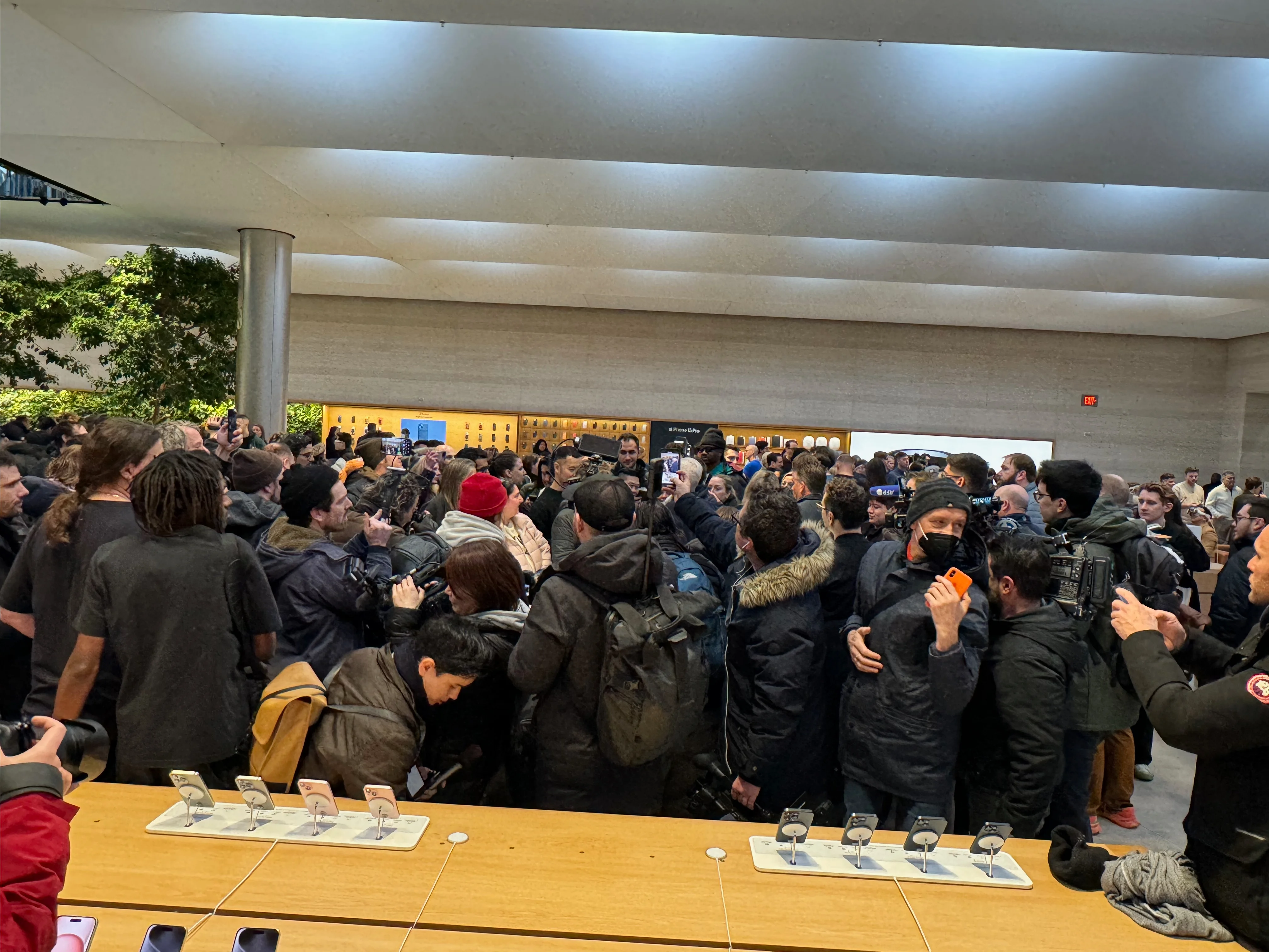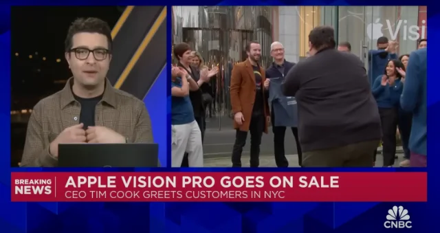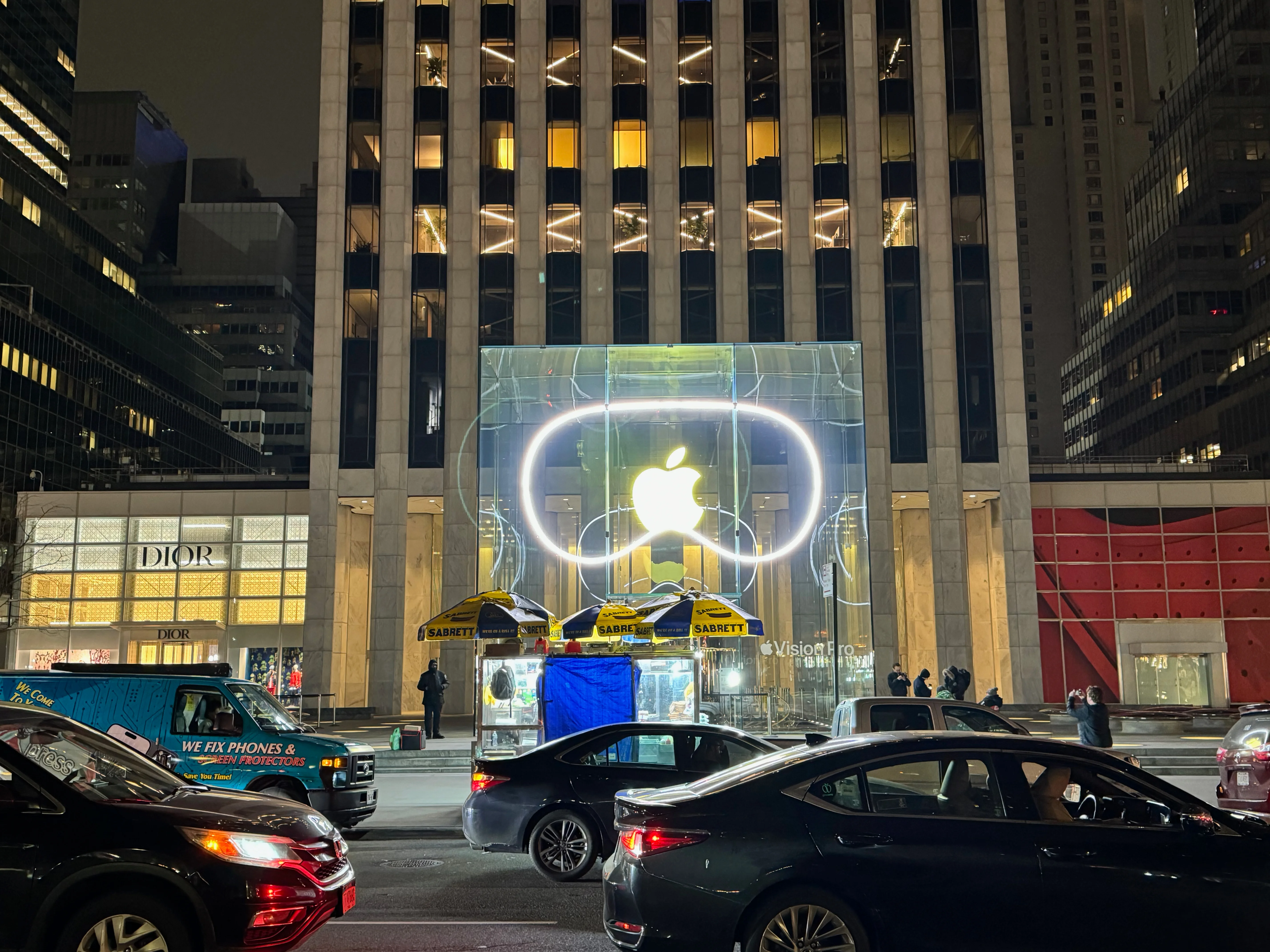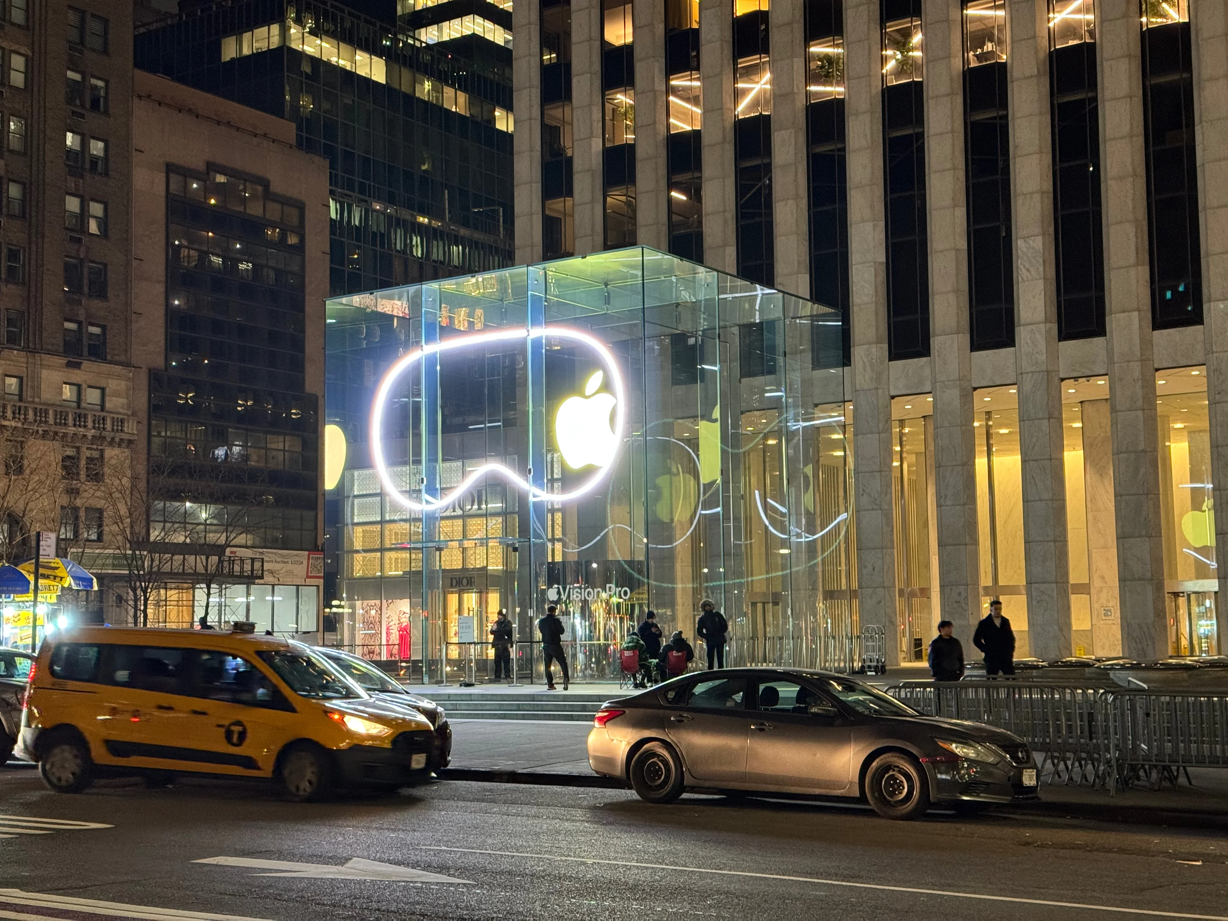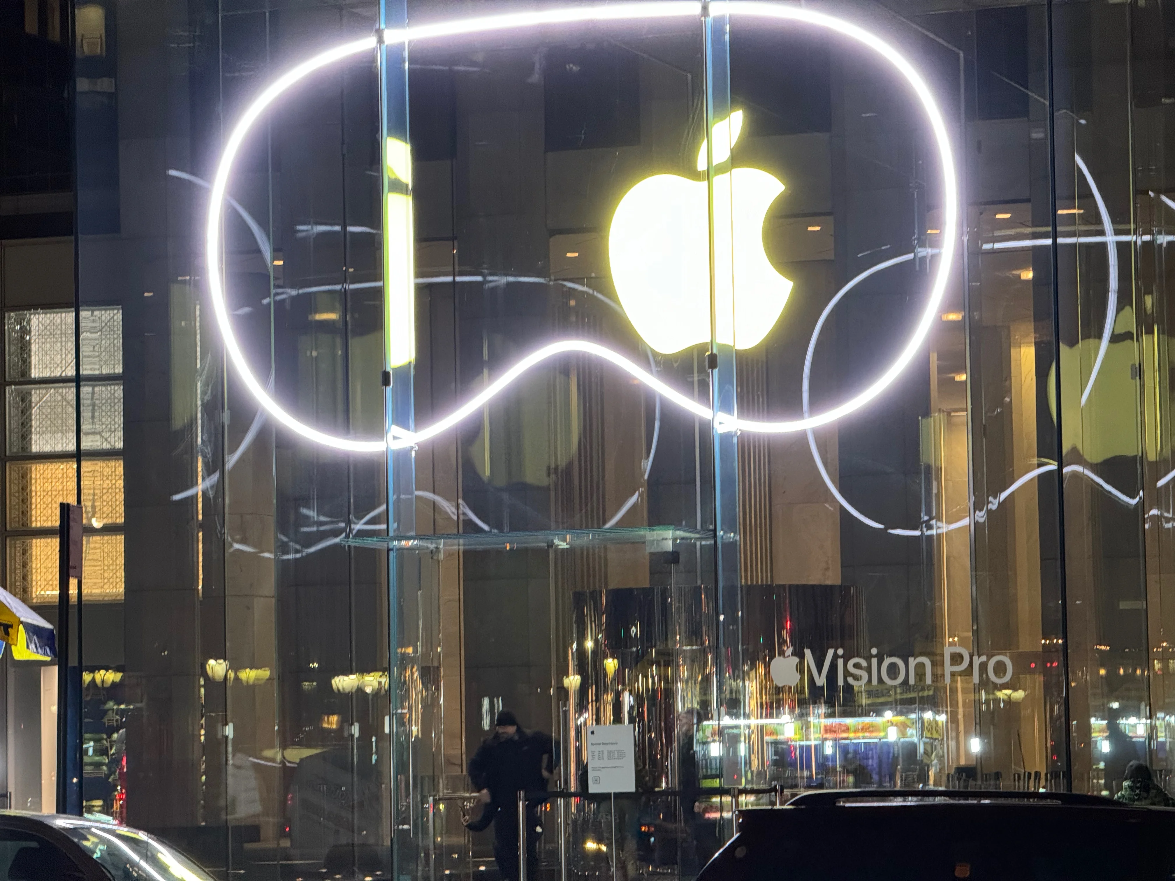 I had an 8:15am appointment at Apple Fifth Avenue to pick up my (cough, two, cough) Apple Vision Pro. I got there around 7:30 because I figured there’d be some amount of cool stuff/vibe happening. I only hoped Tim would be there, as he was for iPhone 15 launch, but I had no way of knowing for sure. Then at maybe 7:40 the crowd reacts and suddenly he’s walking past fist bumping those in queue, Joz closely behind him. I’m not even in queue yet, I was just walking around. I thought this would be it, cool to see him from a near distance. Grabbed a few shots.
