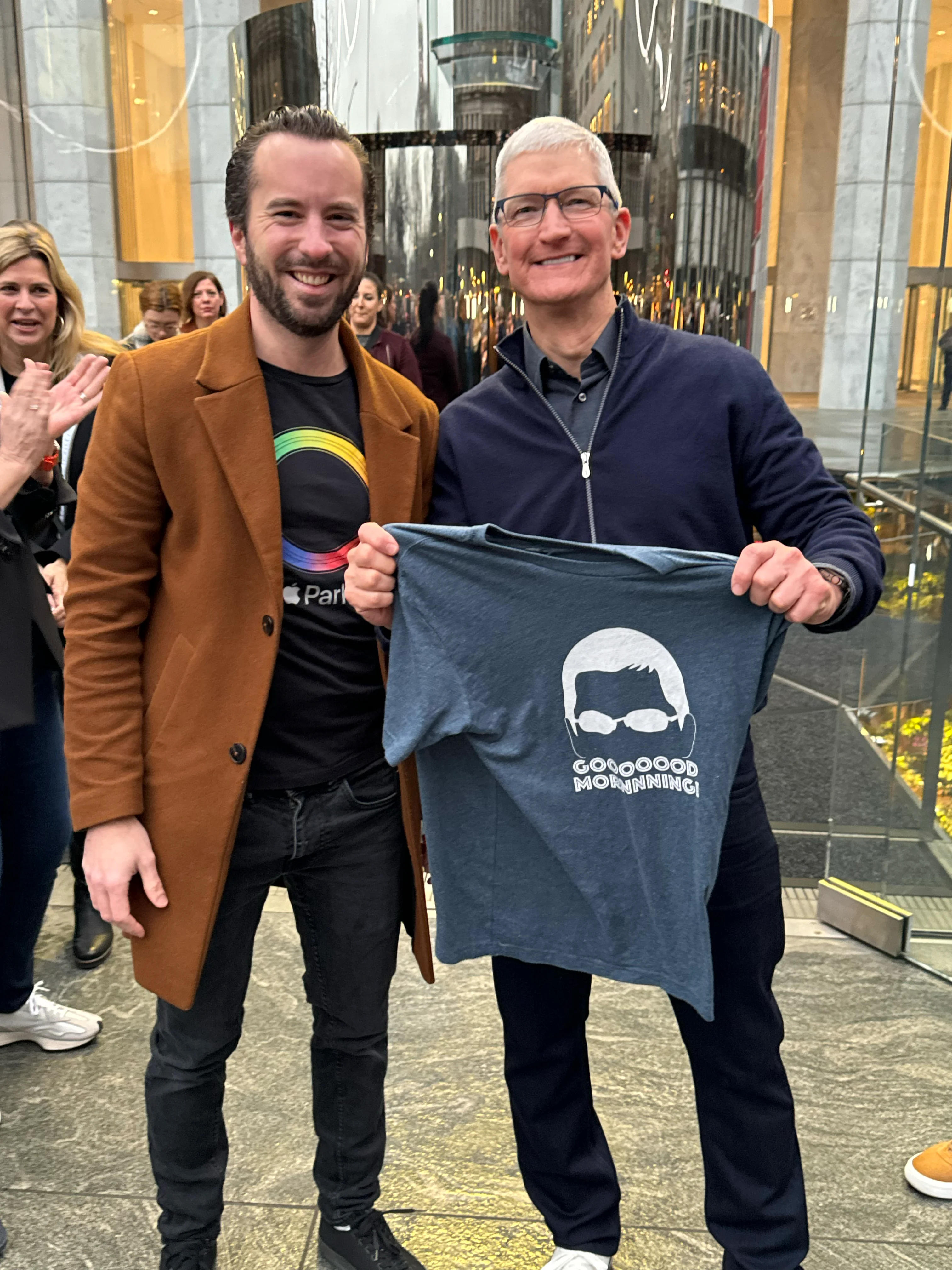 I had the thought that it would be hilarious to wear the “GOOOD MORNING!!!” one IF Tim Cook was going to be there. But last minute, I decided against and went with the Apple Park one, but for some reason I put the “Good morning” one in my jacket pocket. Did I think I would get to hand it to Tim? Very much no. I just decided as I headed out the hotel room to grab it, thinking “Maybe I just put this on top of the other t-shirt if Tim is actually there, and if he seems me it could be really fun”.