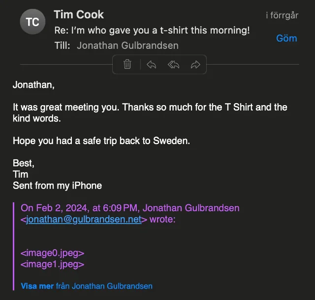 To put an absolute perfect ending to all this, Tim Cook actually responded to my email to him. On my way back on the same day, I just sent a very brief note containing what I would have said if I had my brain not scattered everywhere from the reality of it all when meeting him.